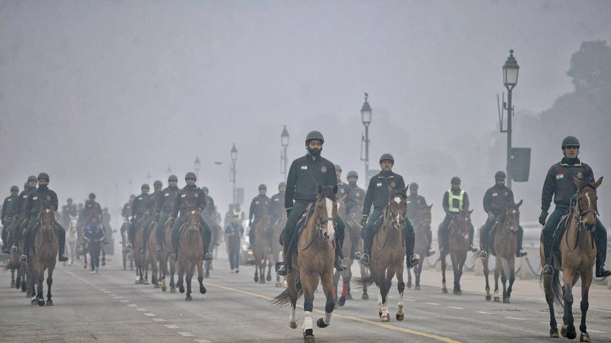 दिल्ली में घने कोहरे और प्रदूषण के बीच कर्तव्य पथ पर गणतंत्र दिवस परेड की रिहर्सल करते राष्ट्रपति के बॉडीगार्ड्स। फोटो - पीटीआई