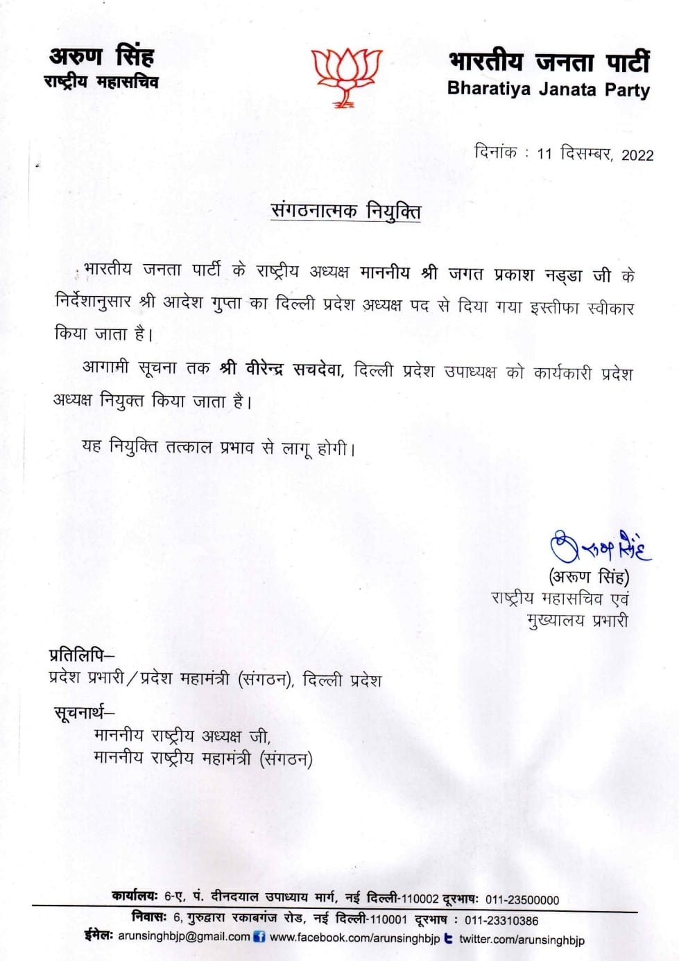 Adesh Gupta Resigns भाजपा के राष्ट्रीय अध्यक्ष जेपी नड्डा ने आदेश गुप्ता का इस्तीफा स्वीकार कर लिया है। आदेश गुप्ता के इस्तीफे के बाद जब तक नए अध्यक्ष ...और पढ़ें
