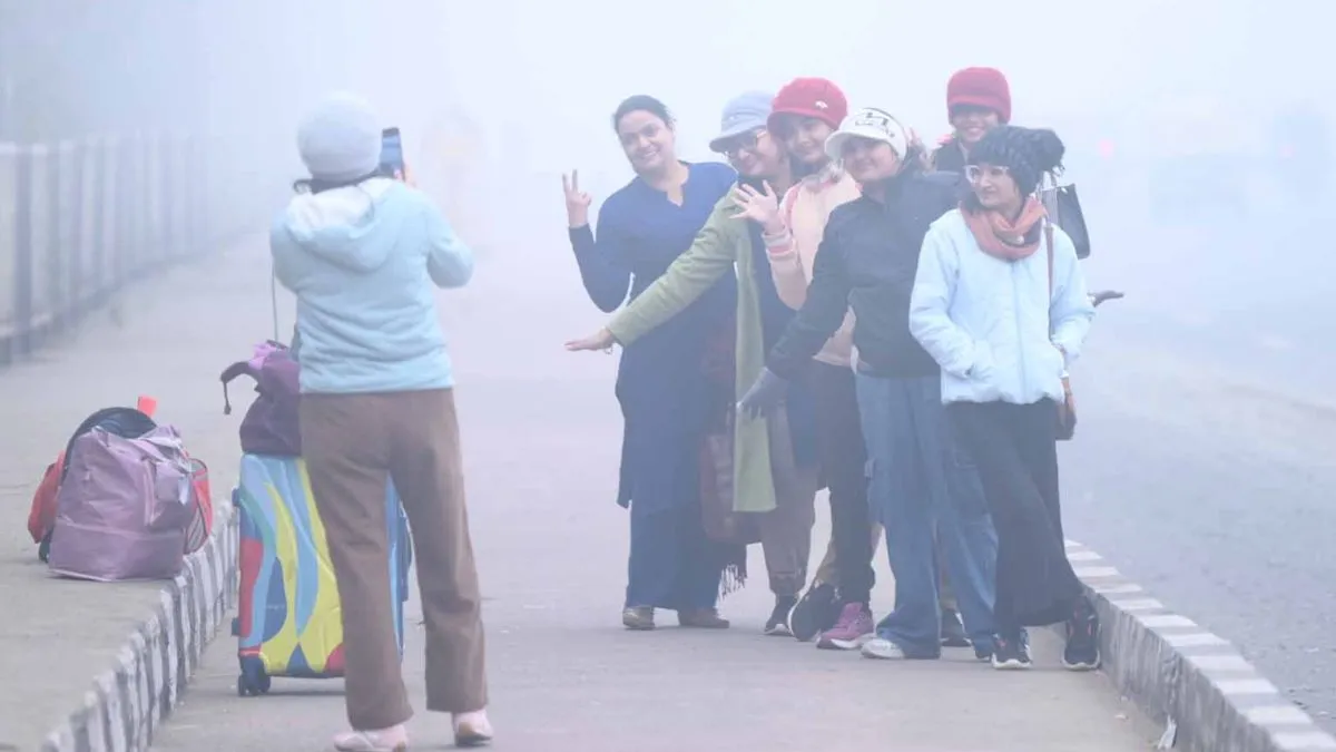 बुधवार को सुबह 9:18 बजे अक्षरधाम के समीप दिल्ली मेरठ एक्सप्रेस वे पर बस के इंतजार के दौरान बढ़ी ठंड और घने कोहरे में सेल्फी लेते युवा। चंद्र प्रकाश मिश्र