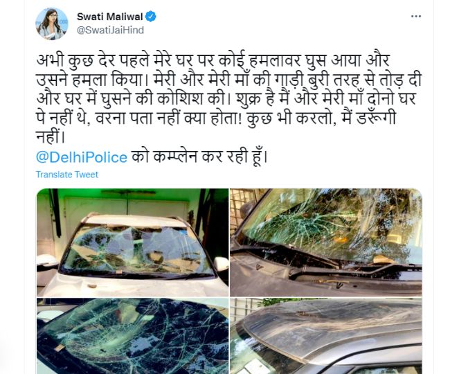 डीसीडब्ल्यू अध्यक्ष स्वाति मालीवाल ने सोमवार की सुबह बताया कि अभी कुछ देर पहले मेरे घर पर कोई हमलावर घुस आया और उसने हमला किया। मेरी और मेरी मां की गाड़ी बुरी तरह से तोड़ दी और घर में घुसने की कोशिश की। शुक्र है मैं और मेरी मां दोनो घर पे नहीं थे, वरना पता नहीं क्या होता! कुछ भी करलो, मैं डरूंगी नहीं। स्वाति मालीवाल ने कहा कि वे दिल्ली पुलिस में मामले की शिकायत कर रही हैं।