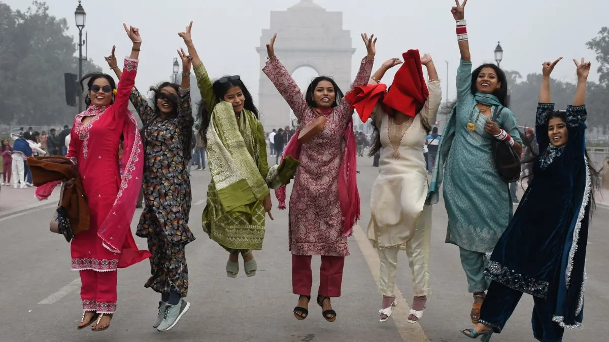 नववर्ष की पूर्व संध्या में इंडिया गेट के कर्तव्य पथ पर पास घूमने पहुंची युवतियां खुशी मनाते हुए। हरीश कुमार