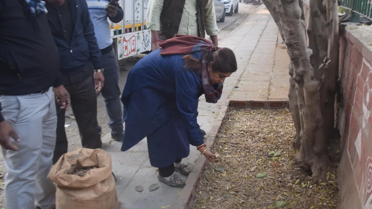 कालकाजी वार्ड में पेड़ के किनारे क्यारी बनाकर मिट्टी के ऊपर मल्चिंग डालतीं पार्षद योगिता सिंह। जागरण