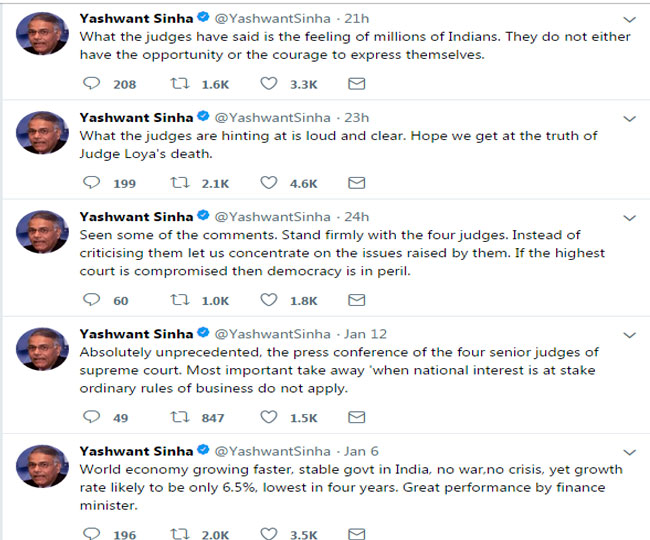 यशवंत सिन्हा ने ट्वीट किया- सुप्रीम कोर्ट के चार वरिष्ठ जजों द्वारा की गई प्रेस कॉन्फ्रेंस निश्चित रूप से अभूतपूर्व थी। सबसे महत्वपूर्ण बात यह है कि जब राष्ट्रीय हित का दाव होता है तब व्यापार के सामान्य नियम लागू नहीं होते हैं। उन्होंने एक के बाद एक कई ट्वीट करते हुए लिखा- मैं कुछ टिप्पणियां देख रहा हूं, चारों जजों के साथ अडिग होकर खड़ा हूं। उनकी आलोचना करने के बजाय उनके द्वारा उठाए गए मुद्दों पर बात करनी चाहिए। अगर शीर्ष अदालत समझौते पर चलती हैं तो लोकतंत्र को जोखिम में समझना चाहिए। उन्होंने कहा कि चारों जज जिस ओर इशारा कर रहे हैं वह एकदम साफ और तेज सुनाई देने वाला है। उम्मीद करता हूं कि जज लोया की मौत से परदा उठेगा।