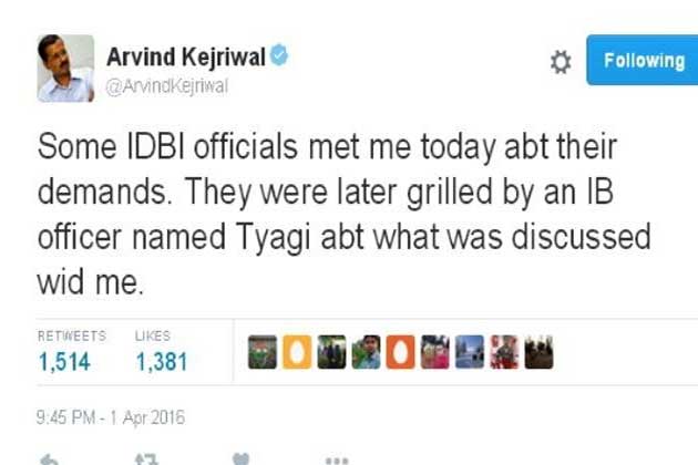 केजरीवाल के मुताबिक, IDBI के कुछ अधिकारियों ने 1 अप्रैल को अपनी मांगों को लेकर मुलाकात की थी। उनसे बाद में खुफिया ब्यूरो के एक अधिकारी ने पूछताछ की। ब्यूरो के अधिकारी ने IDBI के अधिकारियों से पूछा था कि केजरीवाल से उनकी क्या बातचीत हुई?