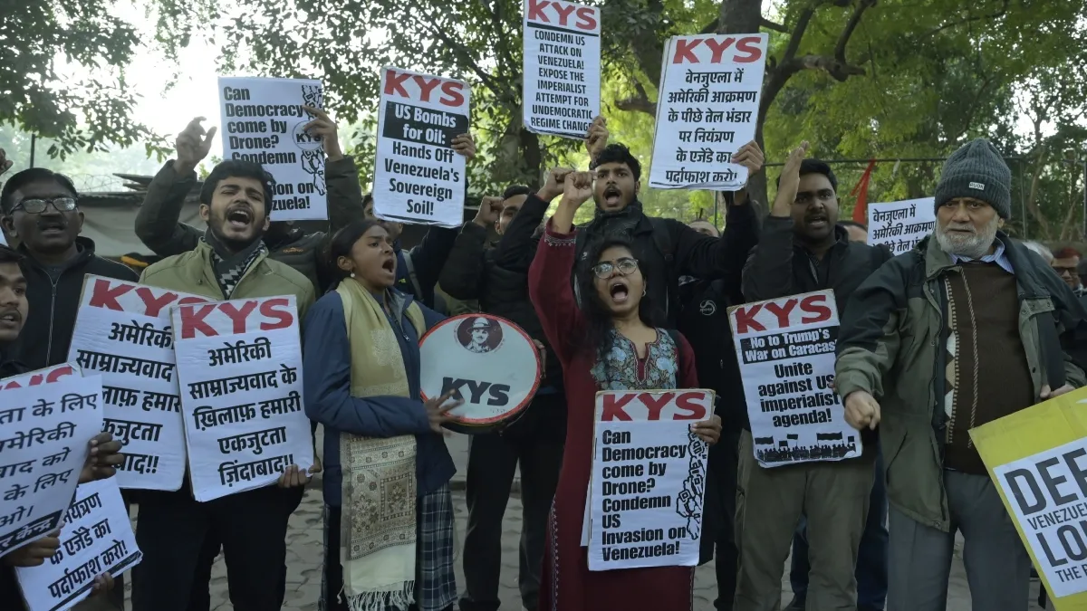 JNU के छात्रों ने वेनेजुएला के राष्ट्रपति मादुरो के समर्थन और अमेरिका के खिलाफ जंतर-मंतर पर किया प्रदर्शन