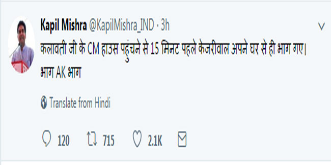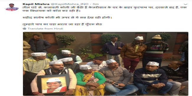 कपिल के मुताबिक आज कलावती कोली इसी मामले पर अरविंद केजरीवाल से मिलने गईं थीं, लेकिन उनके वहां पहुंचने से पहले ही सीएम केजरीवाल अपने घर से 'भाग' गए। कपिल ने ट्वीट कर कहा कि 'तीन घंटे से, कलावती कोली जी बैठी हैं केजरीवाल के घर के बाहर फुटपाथ पर, दरवाजे बंद हैं, एक एक विधायक को कॉल कर रही हैं। शहीद संतोष कोली भी ऊपर से ये सब देख रही होगी। तुम्हारे पाप का घड़ा भरता जा रहा है घुँघरू सेठ।'