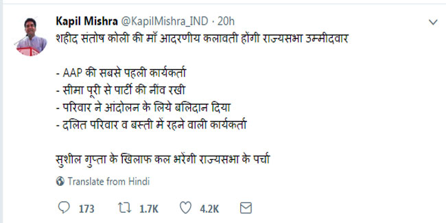 कपिल ने दिवंगत 'आप' नेता संतोष कोली की मां कलावती को राज्यसभा का उम्मीदवार बनाने की घोषणा की है। कपिल मिश्रा ने ट्वीट किया, 'शहीद संतोष कोली की मां आदरणीय कलावती होंगी राज्यसभा उम्मीदवार, वह 'आप' की सबसे पहली कार्यकर्ता हैं, और सीमापुरी से पार्टी की नींव रखी हैं।