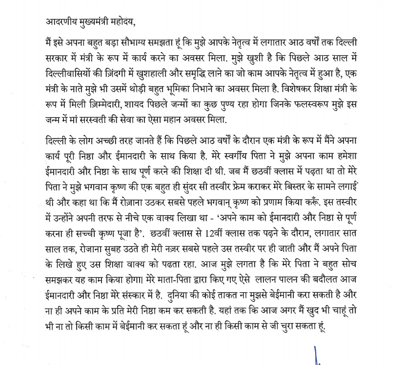 मैंने दिल्ली सरकार के विभिन्न विभागों में ईमानदारी से काम किया है। दिल्ली के सरकारी स्कूलों में पढ़ रहे लाखों बच्चों की दुआएं मेरे साथ हैं। उनके माता पिता का प्यार मेरे साथ है और सबसे बड़ी बात दिल्ली की शिक्षा में क्रांति लाने वाले हजारों शिक्षकों का आशीर्वाद मेरे साथ है। मेरे खिलाफ जिन्होंने जितने भी आरोप लगाए हैं, समय के साथ उनकी सच्चाई सामने आएगी और यह साबित हो जाएगा कि यह सारे आरोप झूठे थे लेकिन अब उन्होंने आरोपों के तहत साजिश रचते हुए तमाम सीमाएं पार कर जेल में डाल दिया है। तो मेरी इच्छा है कि मैं अब मंत्री पद पर न रहूं। आपके नेतृत्व में दिल्ली सरकार का मंत्री होना और दिल्ली के लोगों के लिए काम करना अपने आप में सौभाग्य की बात है लेकिन फिलहाल इस पत्र के माध्यम से मैं अपना त्यागपत्र आपको प्रस्तुत कर रहा हूं। आप मुझे मंत्री पद की जिम्मेदारियों से मुक्त करें।