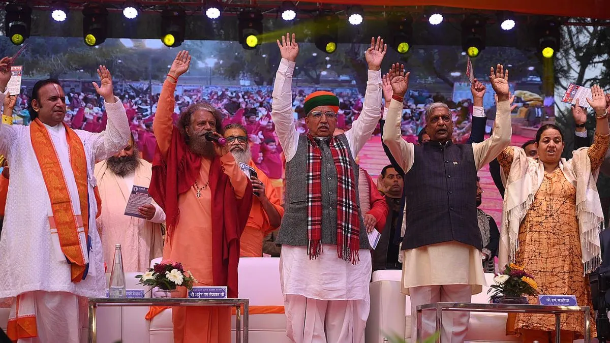 राजघट स्थित गांधी दर्शन में यमुना परिवार काउंसिल द्वारा आयोजित कार्यक्रम यमुना संगम में शपथ दिलाने के बाद जयकारा लगाते केंद्रीय मंत्री अर्जुन राम मेघवाल , स्वामी चिदानंद सरस्वती व अन्य। चंद्र प्रकाश मिश्र