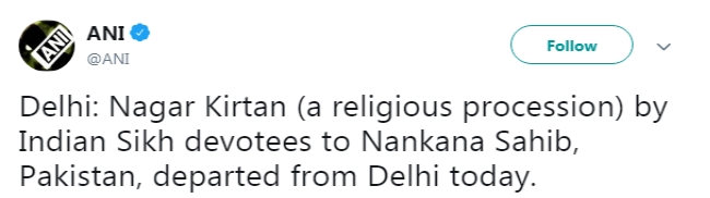 नई दिल्ली, एएनआइ। श्री गुरू नानक देव जी की 550वीं जयंती समारोह में भाग लेने के लिए सिख श्रद्धालुओं का एक जत्था (नगर कीर्तन) दिल्ली से पाकिस्तान के ननकाना साहिब के लिए रवाना हो गया है। पाकिस्तान रवाना होने से पहले नगर दिल्ली में निकाले गए नगर कीर्तन में हजारों की संख्या में सिख श्रद्धालु शामिल हुए।