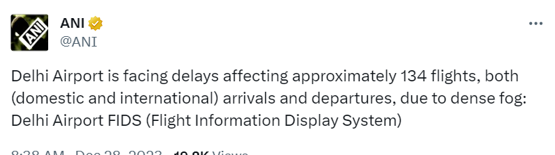 समाचार एजेंसी एएनआई के मुताबिक, घने कोहरे के कारण दिल्ली एयरपोर्ट पर कई लगभग 134 उड़ानें प्रभावित हुई हैं। इसमें घरेलू और अंतरराष्ट्रीय दोनों उड़ानें शामिल हैं। वहीं, दूसरी ओर सड़क मार्ग पर भी कोहरे की वजह से वाहनों की रफ्तार पर लगाम लगी है। इससे लोगों को परेशानी का सामना करना पड़ रहा है।
