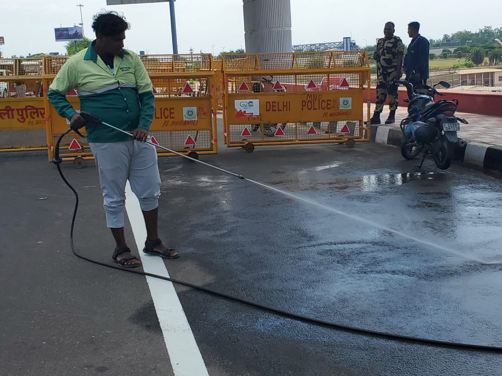 जी-20 के मद्देनजर दिल्ली नगर निगम अक्षरमधाम मंदिर के सामने गाड़ियों के जरिये सड़क की धुलाई कर रहा है।