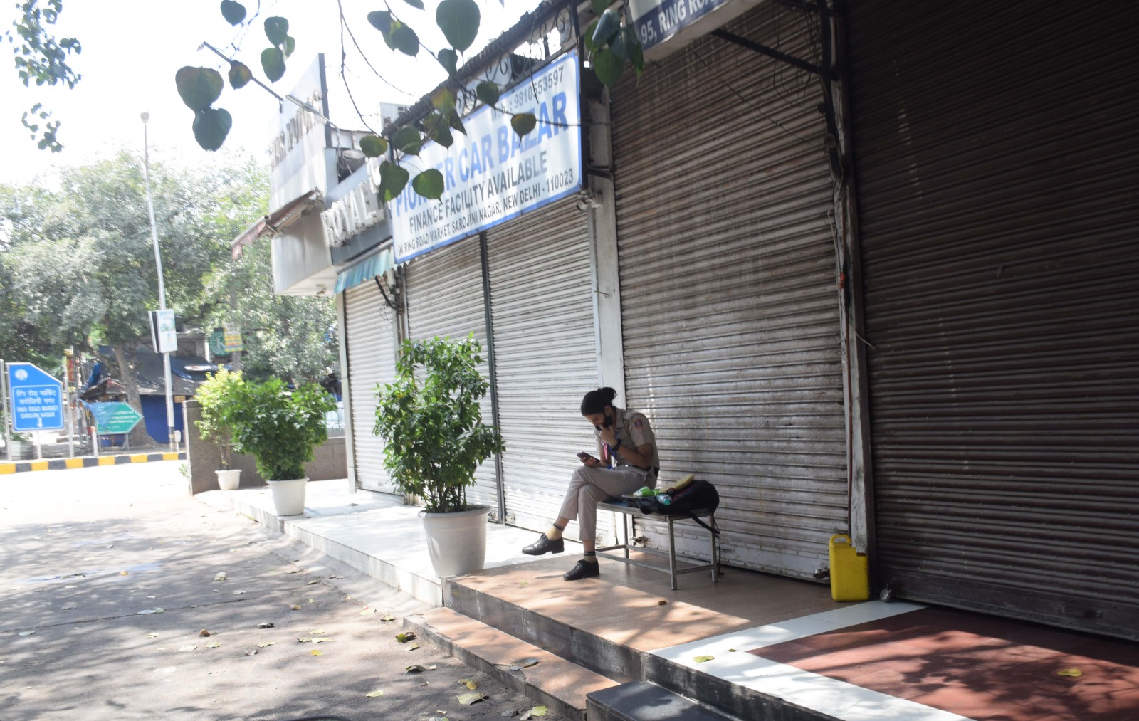 रिंग रोड के पास स्थित नौरोजी नगर मार्केट में बंद दुकानें व उनके बाहर बैठी महिला पुलिसकर्मी।