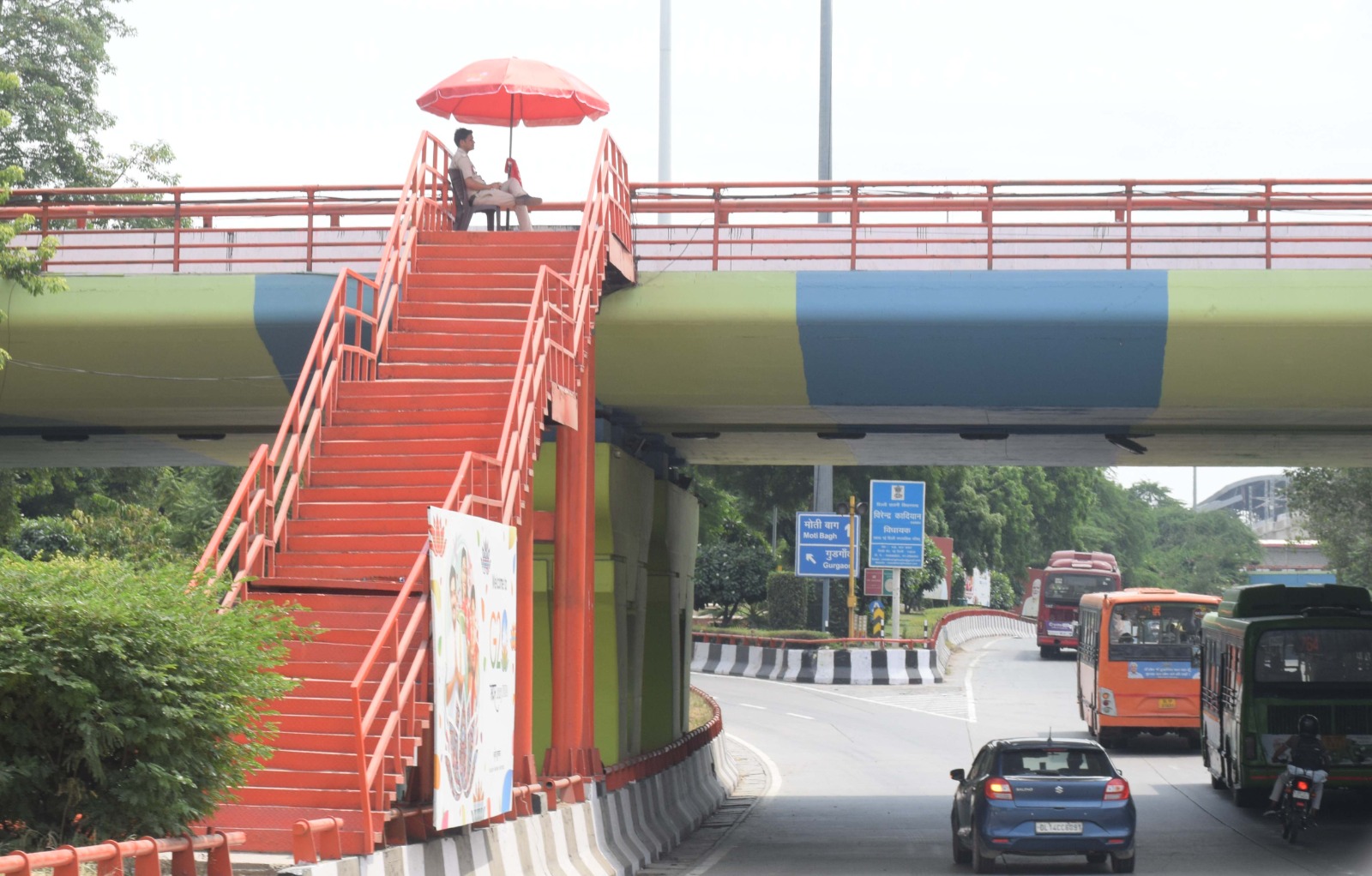 धौला कुआं स्थित फ्लाईओवर के ऊपर की ओर जाने के लिए लगी सीढ़ियों पर पैदल राहगीरों को रोकने के लिए बैठा पुलिसकर्मी।