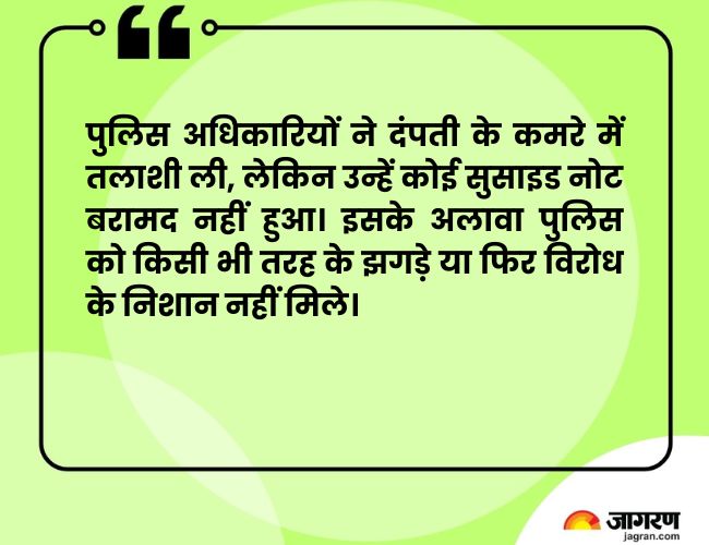 पुलिस अधिकारियों ने दंपती के कमरे में तलाशी ली, लेकिन उन्हें कोई सुसाइड नोट बरामद नहीं हुआ। इसके अलावा पुलिस को किसी भी तरह के झगड़े या फिर विरोध के निशान नहीं मिले। फिलहाल पुलिस मामला दर्ज कर गहन जांच पड़ताल कर रही है। दंपती की शादी के पांच हो हुए हैं। ऐसे में मामले की जानकारी संबंधित एसडीएम को भी दी गई है।