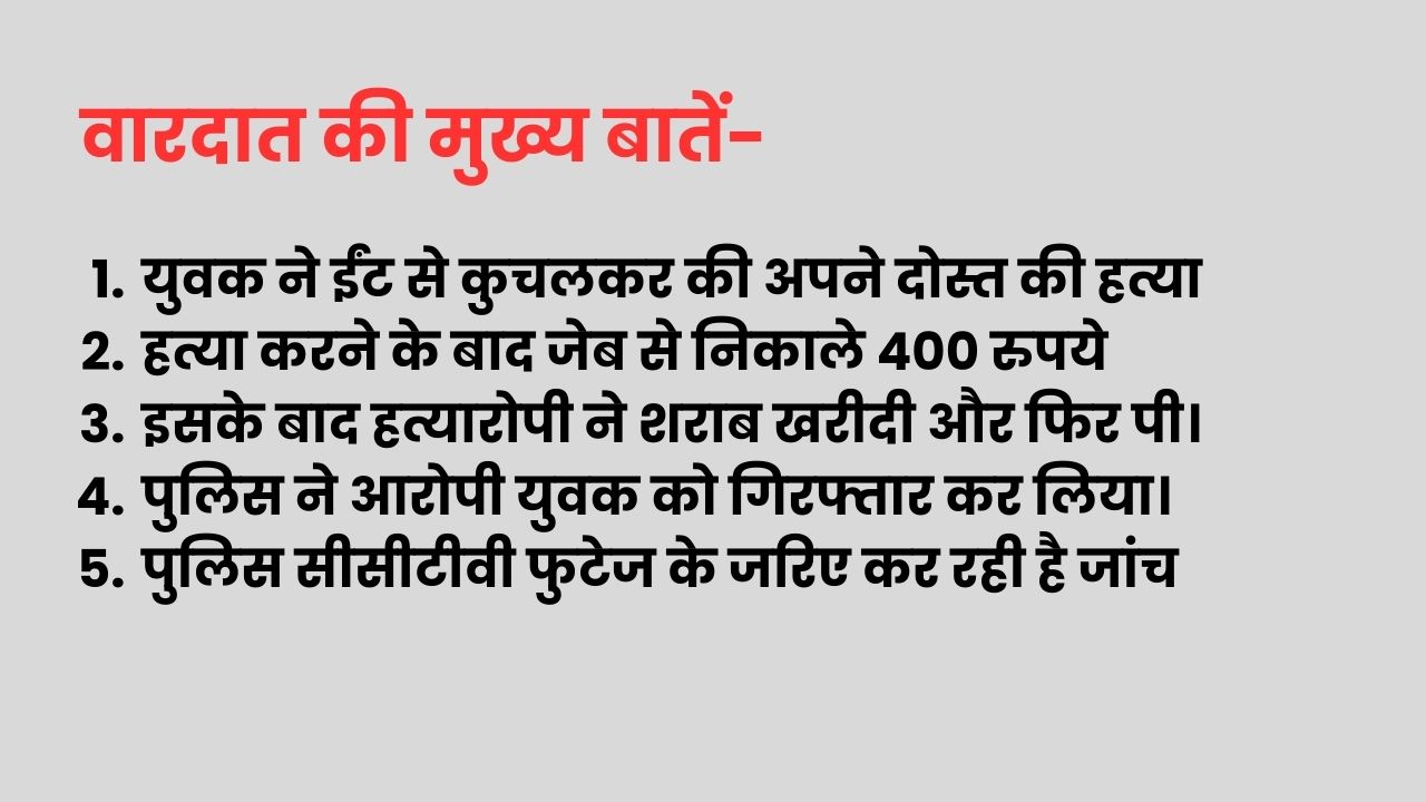 इसके बाद उसने सड़क किनारे पड़ी ईंट उठाई और ताबड़तोड़ वार करके दोस्त की हत्या कर दी। बाद में जेब से रुपये निकाल लिए और शराब खरीदकर पी। वह नशे में सड़क पर गिर गया था, किसी ने उसके स्वजन को सूचना दी। उन्होंने उसे नशा मुक्ति केंद्र में भर्ती करवाया। आरोपित पर पहले से चोरी के छह केस दर्ज हैं।