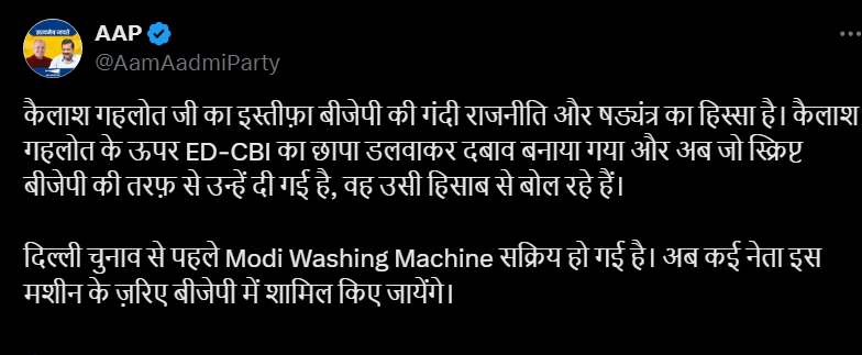 राज्यसभा सांसद और आप नेता संजय सिंह ने कहा, "कैलाश गहलोत का इस्तीफा बीजेपी की गंदी राजनीति और षड्यंत्र का हिस्सा है। कैलाश गहलोत के ऊपर ईडी-सीबीआई का छापा डलवाकर दबाव बनाया गया और अब जो स्क्रिप्ट बीजेपी की तरफ से उन्हें दी गई है, वह उसी हिसाब से बोल रहे हैं। दिल्ली चुनाव से पहले मोदी वाशिंग मशीन सक्रिय हो गई है। अब कई नेता इस मशीन के जरिए बीजेपी में शामिल किए जाएंगे।"
