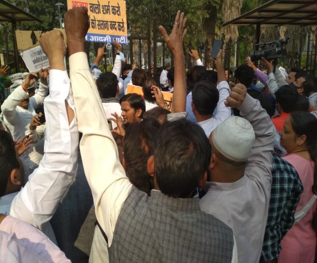 AAP पार्षदों व पार्टी कार्यकर्ताओं का नगर निगम मुख्यालय के बाहर जोरदार प्रदर्शन, कई नेता हिरासत में