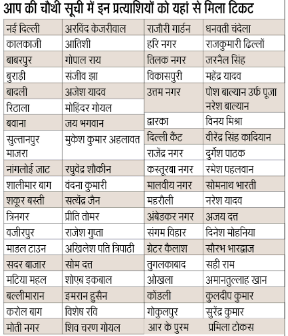 विधानसभा चुनाव को लेकर आम आदमी पार्टी ने टिकट बंटवारे में जिस तरह से अपने विधायकों के पहली और दूसरी सूची में काट दिए थे उससे यह अनुमान लगाया जा रहा था कि चौथी सूची और अंतिम सूची में भी आम आदमी पार्टी अपने विधायकों के बड़ी संख्या में टिकट कटेगी, मगर ऐसा इस सूची में नहीं दिखाई दिया। सबसे खास बात यह है कि आप ने अपने 14 विधायकों पर चौथी बार दांव लगाया है।