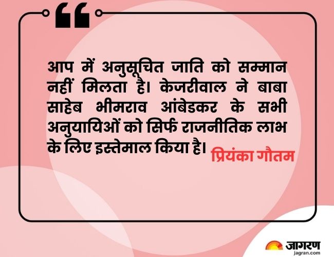 प्रियंका गौतम ने कहा, आप में अनुसूचित जाति को सम्मान नहीं मिलता है। केजरीवाल ने बाबा साहेब भीमराव आंबेडकर के सभी अनुयायिओं को सिर्फ राजनीतिक लाभ के लिए इस्तेमाल किया है। आप में आंतरिक लोकतंत्र नहीं है।