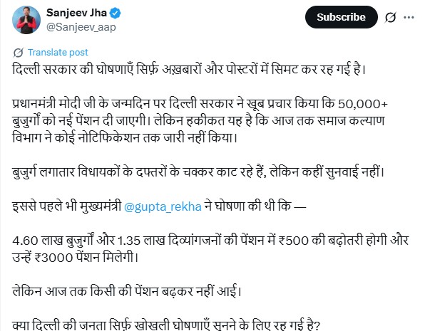 विधायक संजीव झा ने अपने आधिकारिक एक्स अकाउंट पर लिखा, 'दिल्ली सरकार की घोषणाएँ सिर्फ़ अख़बारों और पोस्टरों में सिमट कर रह गई है। प्रधानमंत्री मोदी जी के जन्मदिन पर दिल्ली सरकार ने खूब प्रचार किया कि 50,000+ बुजुर्गों को नई पेंशन दी जाएगी। लेकिन हकीकत यह है कि आज तक समाज कल्याण विभाग ने कोई नोटिफिकेशन तक जारी नहीं किया। बुजुर्ग लगातार विधायकों के दफ्तरों के चक्कर काट रहे हैं, लेकिन कहीं सुनवाई नहीं।'