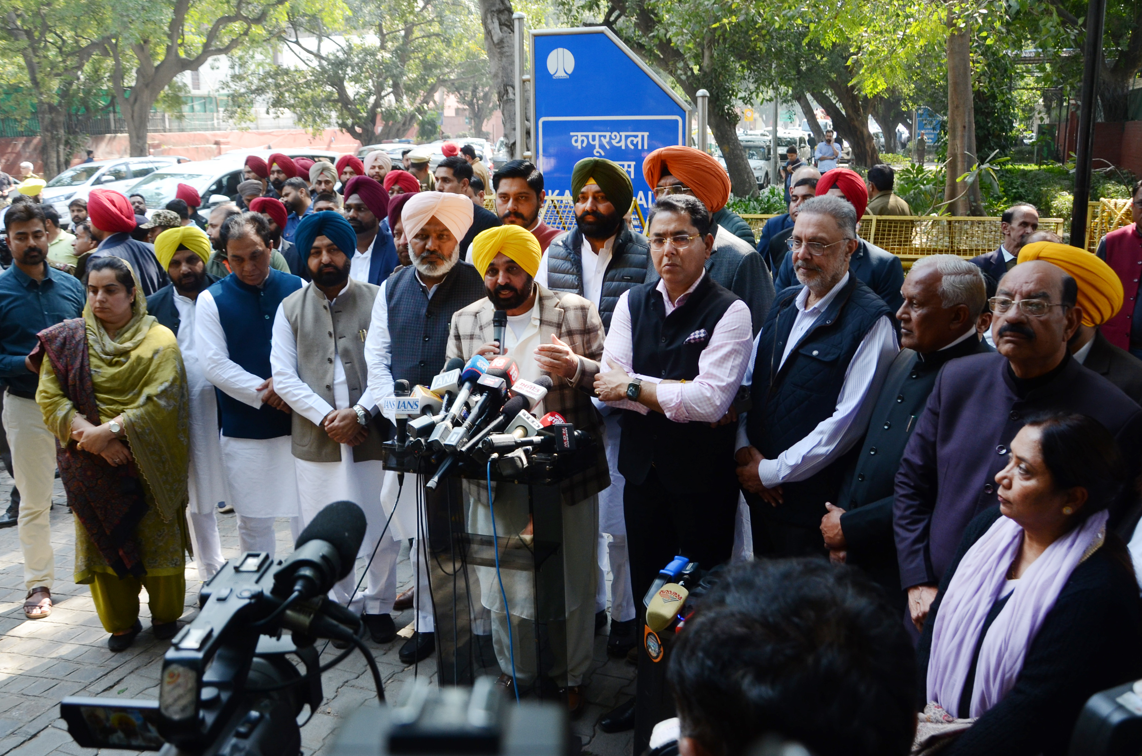 नई दिल्ली के मानसिंह रोड स्थित कपूरथला हाउस में बैठक के बाद बाहर आकर मीडिया को संबोधित करते पंजाब के मुख्यमंत्री भगवंत मान साथ मौजूद पंजाब के आप विधायक। हरीश कुमार