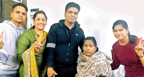 रेखा गुप्ता की माता उर्मिला जिंदल (दाएं से दूसरी), रेखा की बहन डा. राखी (एक दम दाएं), भाई प्रदीप जिंदल (बाएं से तीसरे) l जागरण