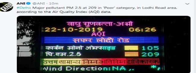 केंद्रीय प्रदूषण नियंत्रण बोर्ड (सीपीसीबी) द्वारा जारी एयर बुलेटिन के मुताबिक सोमवार को दिल्ली का एयर इंडेक्स 249 रहा। गाजियाबाद का 284, ग्रेटर नोएडा का 243, गुरुग्राम का 201 एवं नोएडा का 260 दर्ज किया गया। इस श्रेणी की हवा को खराब श्रेणी में रखा जाता है। सफर के मुताबिक सोमवार को पराली का प्रदूषण दिल्ली में 12 फीसद रहा, जबकि मंगलवार को यह बढ़कर 14 फीसद हो जाएगा।