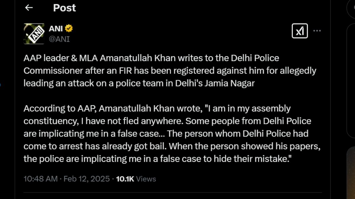 समाचार एजेंसी एएनआई के मुताबिक, अमानतुल्लाह खान ने लिखा, "मैं अपने विधानसभा क्षेत्र में हूं, मैं कहीं भागा नहीं हूं। दिल्ली पुलिस के कुछ लोग मुझे झूठे मामले में फंसा रहे हैं... जिस व्यक्ति को दिल्ली पुलिस गिरफ्तार करने आई थी, उसे पहले ही जमानत मिल चुकी है। जब उस व्यक्ति ने अपने कागजात दिखाए, तो पुलिस अपनी गलती छिपाने के लिए मुझे झूठे मामले में फंसा रही है।"