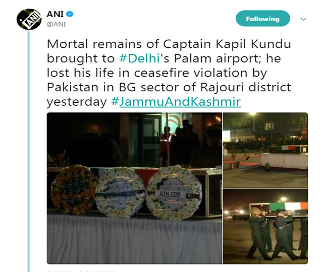 पाकिस्तान की तरफ से किए गए हमले में शहीद हुए कैप्टन कपिल कुंडू का 10 फरवरी को जन्मदिन था। कपिल इस मौके पर घर आने वाले थे। कपिल की मां ने कहा कि बेटे को खोने का दुख है, लेकिन वह देश के लिए शहीद हुआ इसका गर्व भी है। अगर और बेटे होते तो मैं उन्हें भी मोर्चे पर भेज देती। रविवार को पाकिस्तान ने जम्मू-कश्मीर के राजौरी और पुंछ सेक्टर में बंकर उड़ाने वाले हथियारों और एंटी टैंक मिसाइल से हमला किया था, जिसमें कैप्टन कुंडू समेत चार जवान शहीद हो गए थे।