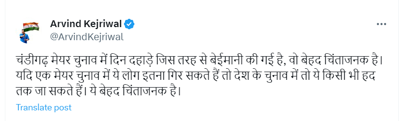 चंडीगढ़ मेयर चुनाव में दिनदहाड़े जिस तरह से बेईमानी की गई है, वो बेहद चिंताजनक है। यदि एक मेयर चुनाव में ये लोग इतना गिर सकते हैं तो देश के चुनाव में तो ये किसी भी हद तक जा सकते हैं। ये बेहद चिंताजनक है।