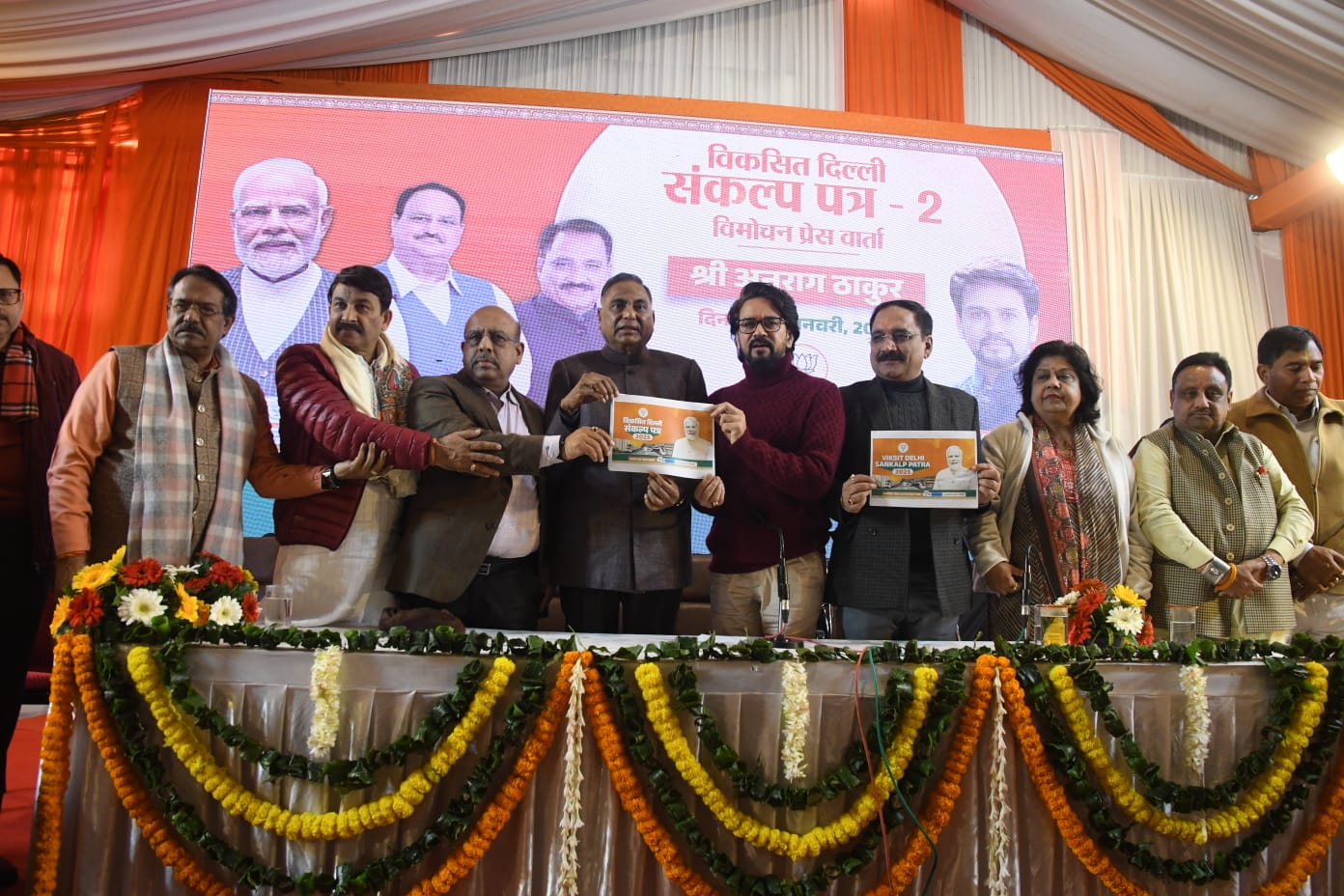 भाजपा प्रदेश मुख्यालय में संकल्प पत्र 2 जारी करते सांसद अनुराग ठाकुर साथ में भाजपा प्रदेश अध्यक्ष वीरेंद्र सचदेवा,मनोज तिवारी,हर्ष मल्होत्रा, नेता प्रतिपक्ष विजेंद्र गुप्ता व अन्य।