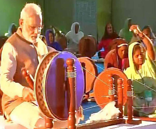 गोल ऐनक और सफेद धोती पहने गांधी जी की चरखा चलाती ऐतिहासिक फोटो पिछली कई पीढि़यों के जेहन पर अब तक अमिट छाप छोड़ चुकी है। लेकिन इस दफा पहली बार है कि मोदी अपने विशिष्ट पहचान वाले परिधान कुर्ता-पायजामा-जैकेट पहने थोड़े आधुनिक से चरखा चलाते नजर आ रहे हैं।