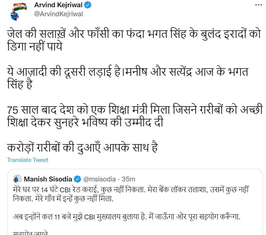 डिप्टी सीएम के ट्वीट को सीएम अरविंद केजरीवाल ने रिट्वीट करते हुए कहा, "जेल की सलाखें और फांसी का फंदा भगत सिंह के बुलंद इरादों को डिगा नहीं पाए, ये आजादी की दूसरी लड़ाई है। मनीष और सत्येंद्र आज के भगत सिंह हैं। 75 साल बाद देश को एक शिक्षा मंत्री मिला, जिसने गरीबों को अच्छी शिक्षा देकर सुनहरे भविष्य की उम्मीद दी। करोड़ों गरीबों की दुआएं आपके साथ हैं।"