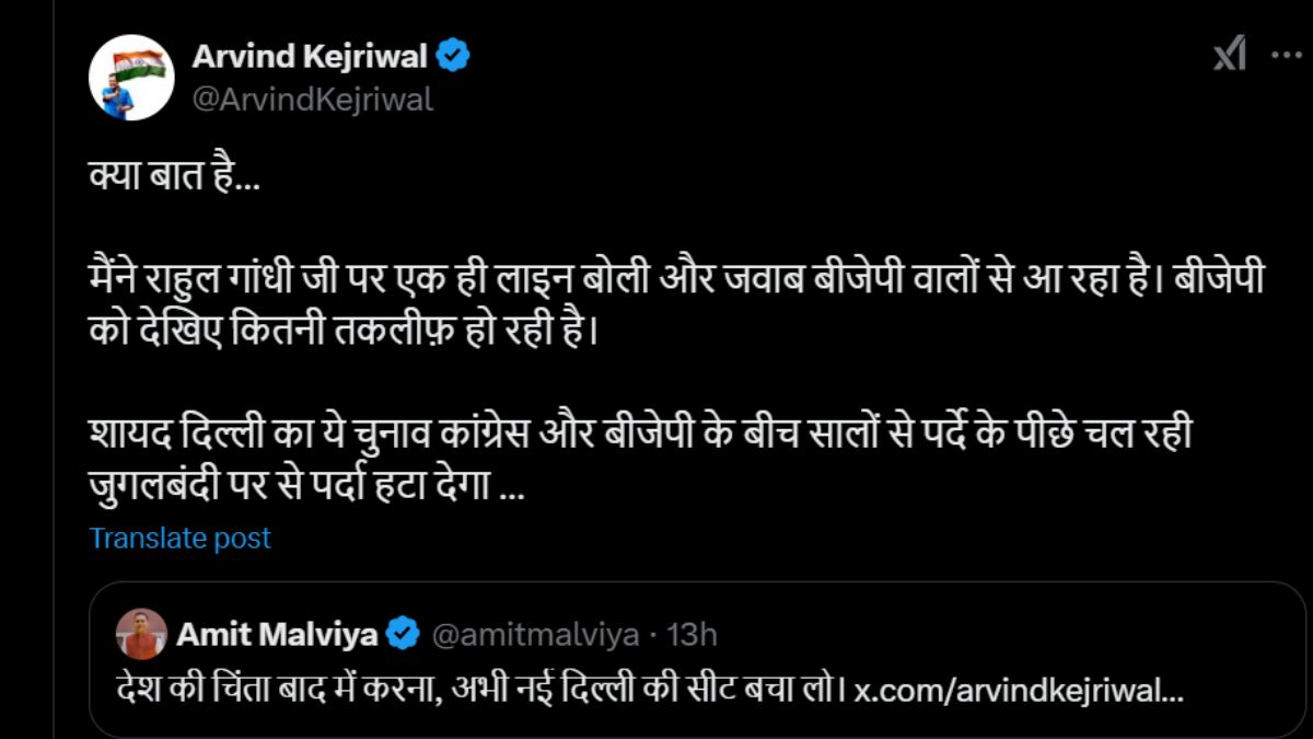 आप संयोजक ने भाजपा आईटी सेल के प्रमुख अमित मालवीय एक पोस्ट के जवाब में कहा, "क्या बात है… मैंने राहुल गांधी जी पर एक ही लाइन बोली और जवाब बीजेपी वालों से आ रहा है। बीजेपी को देखिए कितनी तकलीफ हो रही है। शायद दिल्ली का ये चुनाव कांग्रेस और बीजेपी के बीच सालों से पर्दे के पीछे चल रही जुगलबंदी पर से पर्दा हटा देगा …।"