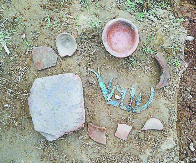 इस कंकाल के साथ एक कटार मिली है। इसके पास दो और कंकाल मिले हैं। हालांकि, शरीर का पूरा ढांचा नहीं मिला है। एएसआइ के विशेषज्ञों का अनुमान है कि इन लोगों की मौत कहीं और हुई हो और वहां से लाकर इन्हें यहां दफनाया गया हो। तीन स्थानों पर अलग-अलग सामान मिले हैं, जिससे माना जा रहा है कि यह किसी की याद में प्रतीकात्मक रूप में रखे गए होंगे। कुछ दूरी पर एक कुत्ता और एक पक्षी का भी कंकाल मिला है। खोदाई में मृदभांड (मिट्टी के बर्तन), तांबे की तलवारें, मशाल व ढाल भी मिली हैं।