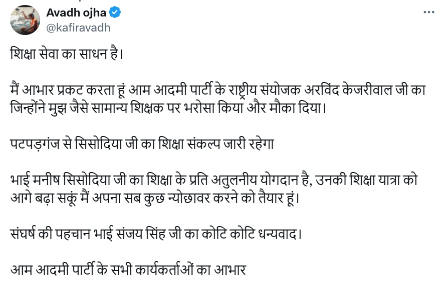आप से विधायकी के लिए टिकट मिलने के बाद अवध ओझा (Avadh Ojha) का बयान भी सामने आया है। उन्होंने आम आदमी पार्टी का आभार जताया है।