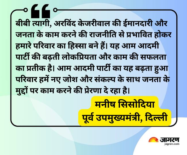 इस दौरान मनीष सिसोदिया ने कहा, "हमें बहुत खुशी है कि बीबी त्यागी, जो भारतीय जनता पार्टी के बड़े नेता रहे हैं और जिन्होंने कई दशकों तक जमीनी स्तर पर जनता के मुद्दों पर काम किया है, आज आम आदमी पार्टी में शामिल हुए हैं। उनके लंबे राजनीतिक अनुभव और जनता की सेवा के प्रति उनकी प्रतिबद्धता हमारे लिए एक अनमोल संपत्ति है।"