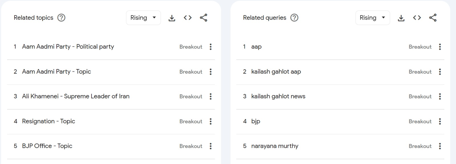 कैलाश गहलोत के लगातार गूगल पर ट्रेंड करने के साथ ही यूजर कई और कीवर्ड से भी उनके बारे में सर्च कर रहे हैं। जैसे- कैलाश गहलोत आप, कैलाश गहलोत इस्तीफा, कैलाश गहलोत आप न्यूज, आप, बीजेपी, आम आदमी पार्टी, रिजाइन, बीजेपी ऑफिस आदि कीवर्ड भी गूगल पर ट्रेंड करने लगे हैं।