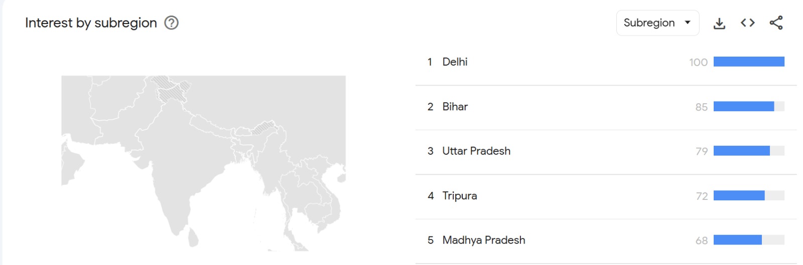 कैलाश गहलोत के बारे में दिल्ली के लोग तो गूगल पर सर्च कर ही रहे हैं। दिल्ली के अलावा, बिहार, उत्तर प्रदेश, त्रिपुरा और मध्य प्रदेश समेत देश भर में लोग कैलाश गहलोत कीवर्ड से गूगल पर सर्च कर रहे हैं।