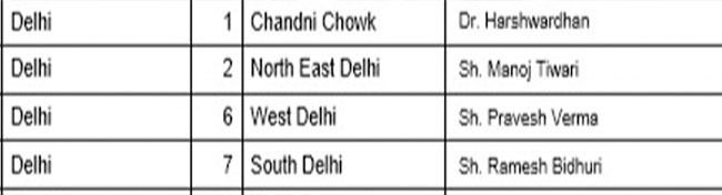 नई दिल्ली, जेएनएन। Lok Sabha Election 2019: लोकसभा चुनाव- 2019 के तहत दिल्ली में 12 मई को होने वाले मतदान के मद्देनजर भाजपा ने दिल्ली की चार लोकसभा सीटों पर अपने प्रत्याशियों के नामों का ऐलान कर दिया है। रविवार शाम को जारी भाजपा की ताजा सूची के मुताबिक, उत्तर पूर्वी दिल्ली से मनोज तिवारी, दक्षिणी दिल्ली से रमेश बिधूड़ी, पश्चिमी दिल्ली से प्रवेश वर्मा और चांदनी चौक सीट पर हर्षवर्धन को उम्मीदवार बनाया गया है। इन चारों सीटों पर भाजपा ने अपने मौजूदा सांसदों पर भरोसा जताया है, जबकि बाकी बची तीन सीटों पर अभी सस्पेंस, जिस पर जल्द खुलासा होगा।