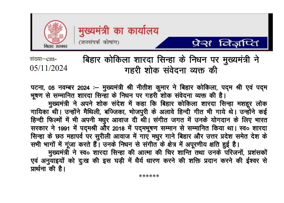 सुप्रसिद्ध लोक गायिका शारदा सिन्हा जी के निधन से अत्यंत दुख हुआ है। उनके गाए मैथिली और भोजपुरी के लोकगीत पिछले कई दशकों से बेहद लोकप्रिय रहे हैं। आस्था के महापर्व छठ से जुड़े उनके सुमधुर गीतों की गूंज भी सदैव बनी रहेगी। उनका जाना संगीत जगत के लिए एक अपूरणीय क्षति है। शोक की इस… pic.twitter.com/sOaLvUOnrW