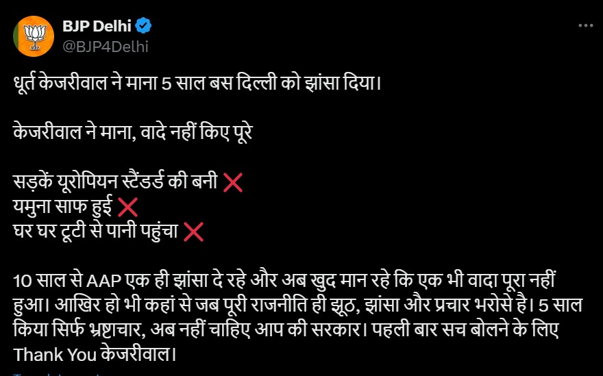 इससे पहले भाजपा (Delhi BJP) ने अपने एक्स पर पोस्ट करते हुए लिखा कि धूर्त केजरीवाल ने माना 5 साल बस दिल्ली को झांसा दिया। केजरीवाल ने माना, वादे नहीं किए पूरे।