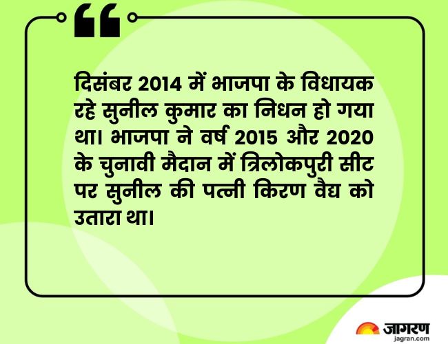 दिसंबर 2014 में भाजपा के विधायक रहे सुनील कुमार का निधन हो गया था। भाजपा ने वर्ष 2015 और 2020 के चुनावी मैदान में त्रिलोकपुरी सीट पर सुनील की पत्नी किरण वैद्य को उतारा था।