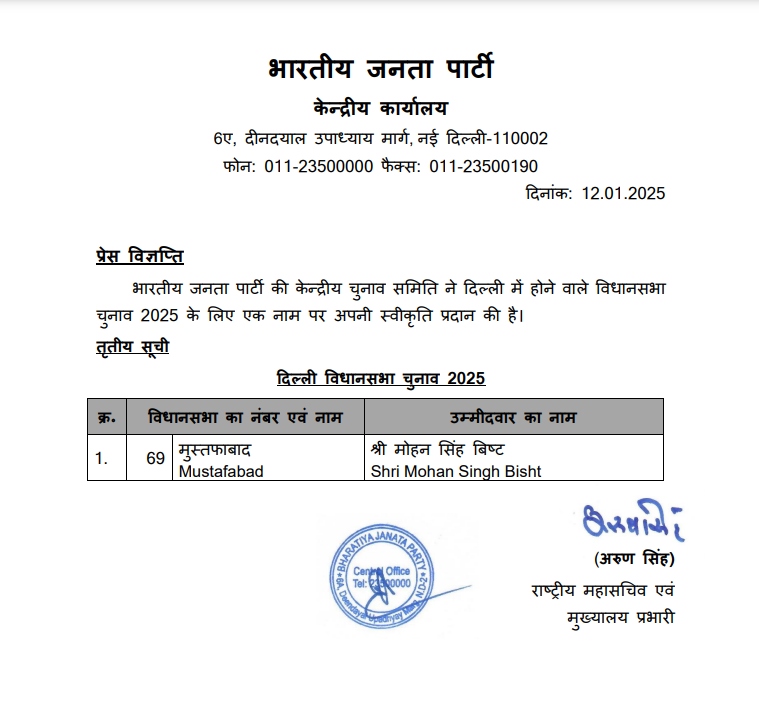 जागरण संवाददाता, नई दिल्ली। भारतीय जनता पार्टी (बीजेपी) ने दिल्ली विधानसभा चुनाव के लिए शनिवार को अपनी दूसरी लिस्ट जारी कर दी थी। इस लिस्ट में करावल नगर से मौजूदा विधायक मोहन सिंह बिष्ट का टिकट काट दिया गया था। अब बीजेपी ने तीसरी लिस्ट जारी कर उन्हें मुस्तफाबाद सीट से चुनाव लड़ने का मौका दिया है।