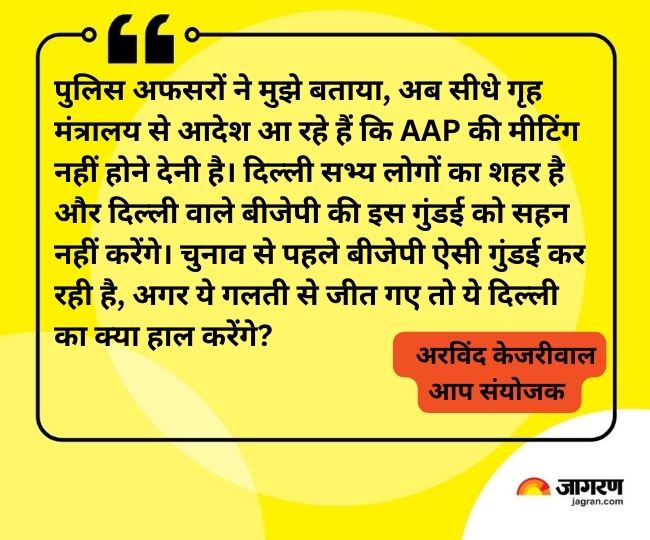 केजरीवाल ने दावा किया कि मेरी कुछ थानाध्यक्षों से बात हुई है। उन्होंने बताया है कि भाजपा को संरक्षण देने के लिए सीधे उनके पास गृह मंत्रालय से संदेश आ रहे हैं कि कहां-कहां पर आम आदमी पार्टी के प्रत्याशियों की बैठकें निरस्त करनी है या उन्हें अनुमति नहीं देनी है।