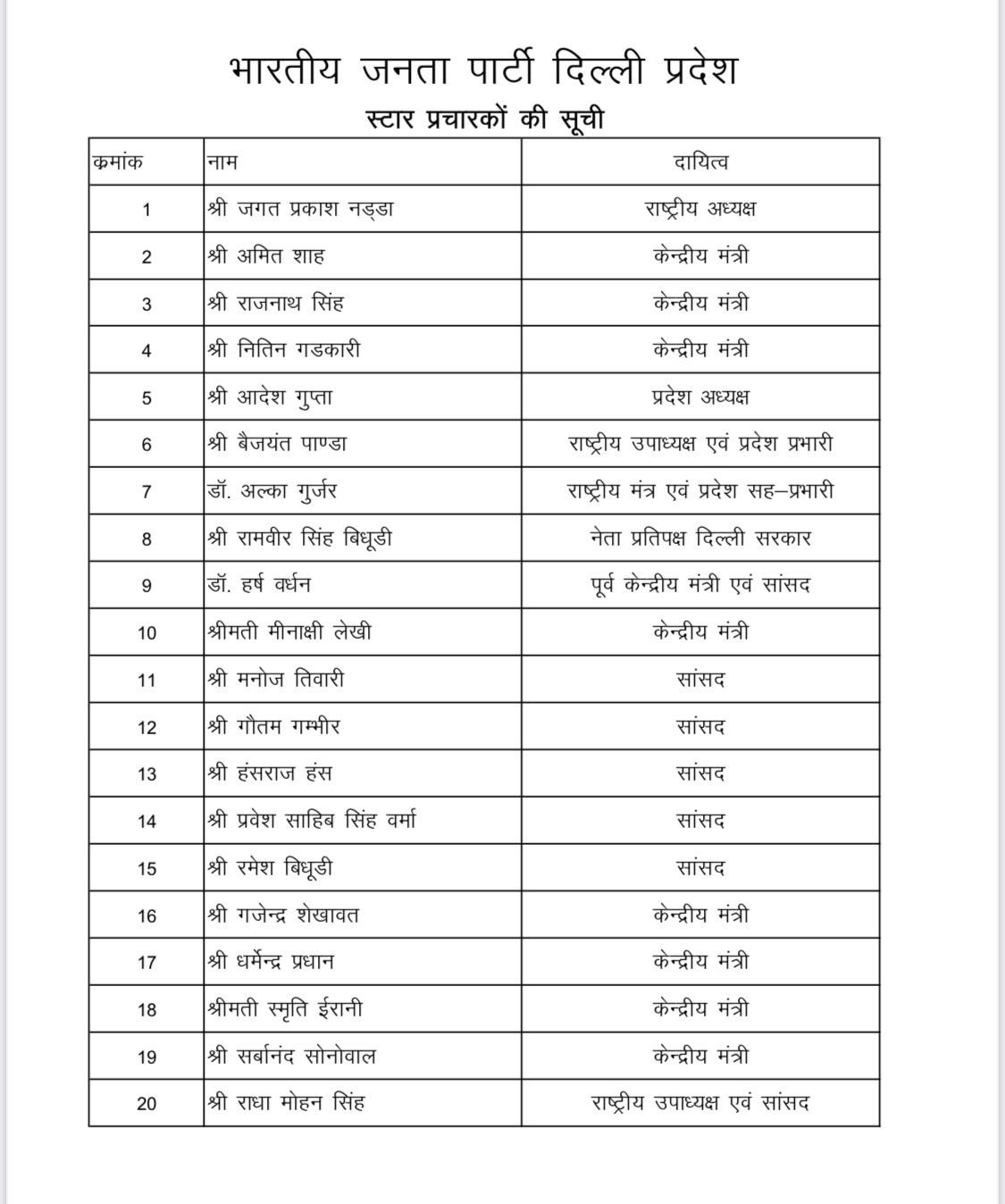 केंद्रीय गृह मंत्री अमित शाह, भाजपा के राष्ट्रीय अध्यक्ष जेपी नड्डा, रक्षा मंत्री राजनाथ, केंद्रीय परिवहन मंत्री नितिन गडकरी, दिल्ली भाजपा के अध्यक्ष आदेश गुप्ता सहित कई नेताओं, सांसदों, केंद्रीय मंत्रियों के नाम हैं।