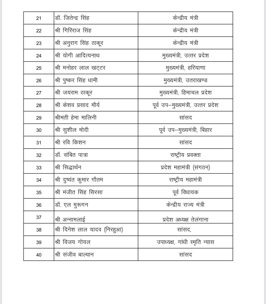 BJP की स्टार प्रचारकों की लिस्ट में 13 केंद्रीय मंत्री, 10 सांसद, चार मुख्यमंत्री और 3 पूर्व मुख्यमंत्री हैं। ये सभी स्टार प्रचारक भाजपा के लिए वार्डों में जाकर लोगों से संपर्क साधेंगे।