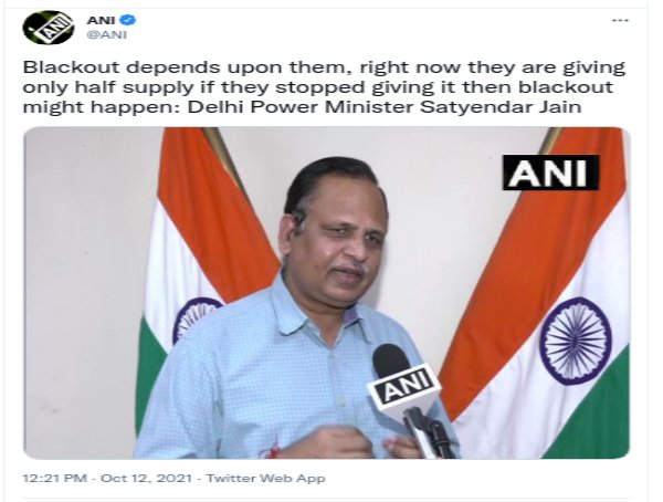 सत्येंद्र जैन ने कहा कि दिल्ली में कोई कोयला बिजली संयंत्र नहीं है। हम दूसरे राज्यों में स्थित कोयला संयंत्रों से बिजली खरीदते हैं। एनटीपीसी ने अपने सभी संयंत्रों की उत्पादन क्षमता को आधा कर दिया है। इसके दो कारण हो सकते हैं, पहला कोयले की कमी या दूसरा केंद्र ने उन्हें ऐसा करने के लिए कहा है।
