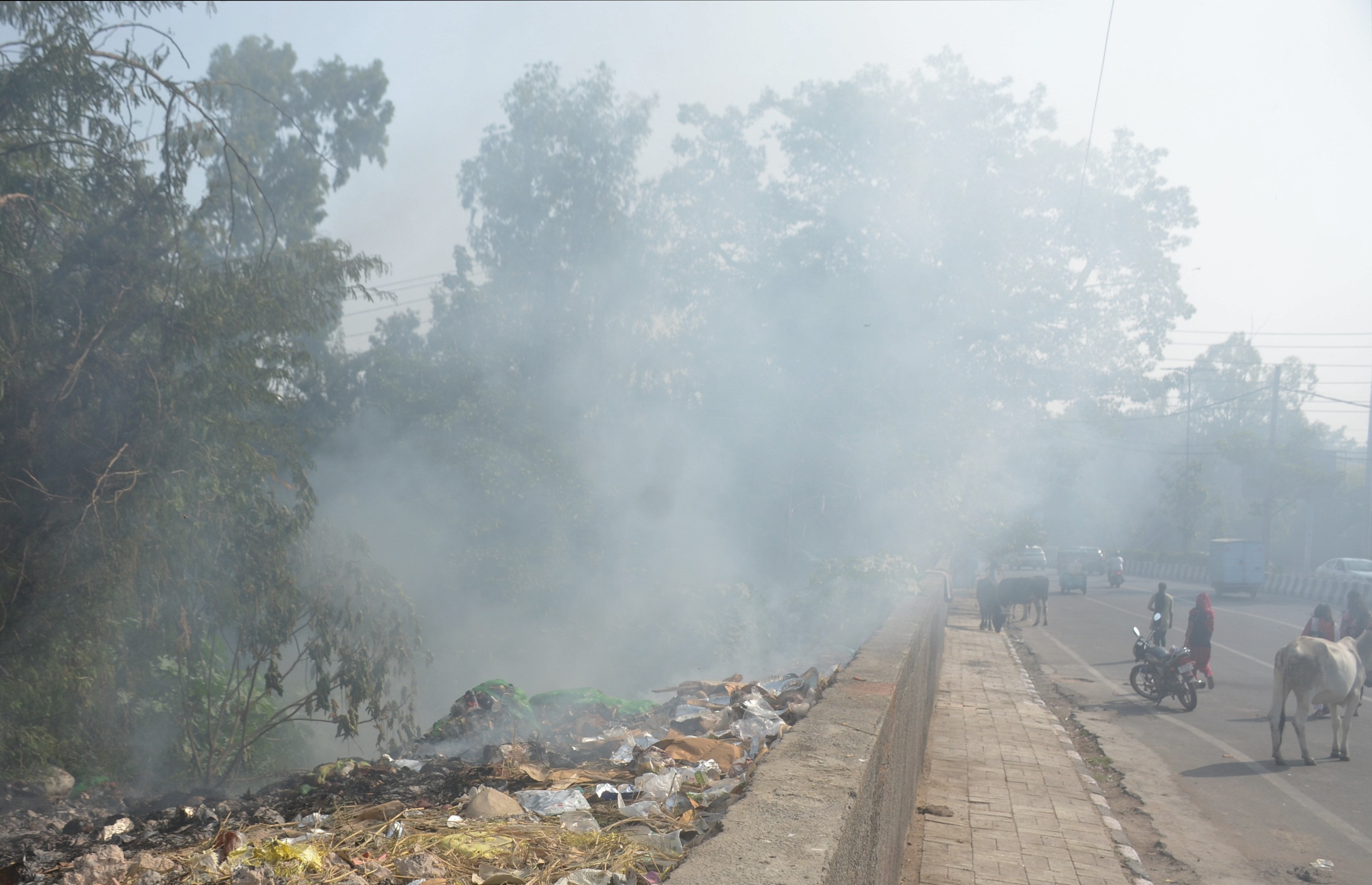 कन्हैया नगर मेट्रो स्टेशन के पास जलते कूड़े से उठता धुआं।